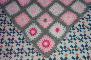 Por todo el alrededor le hice una puntilla del color de fondo, en este caso gris claro, es muy fácil, son seis puntos altos por cada grupo de varetas, y uniéndola con un punto bajo, en las esquinas hacemos seis puntos altos dos cadenetas y seis puntos altos en el mismo sitio para que quede cuadrado.